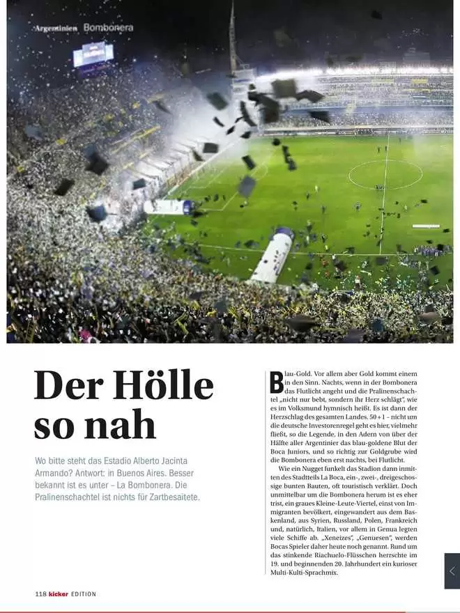De acuerdo con uno de los más recientes informes sobre equipos, tradiciones y estadios por parte de la prensa alemana, el escenario de Boca Juniors es el más emocionante para los locales y el más estremecedor para sus rivales.