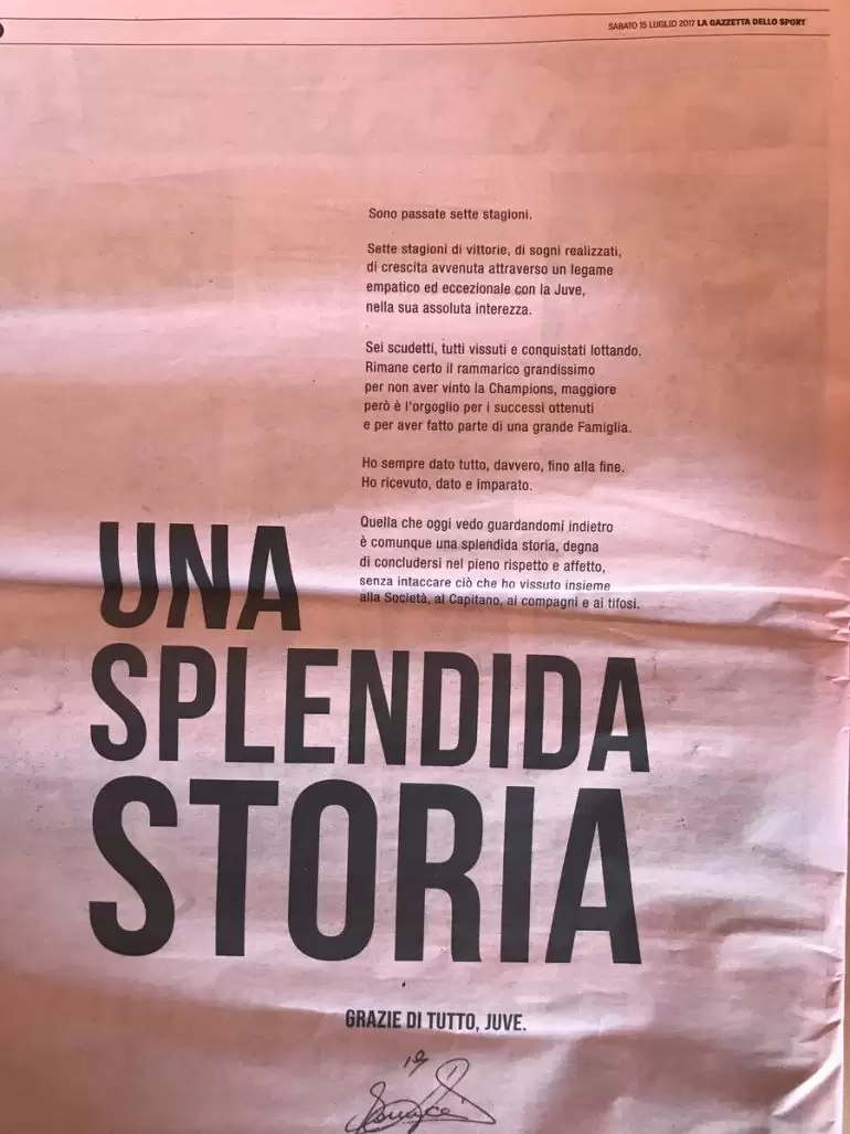 En medio de la nostalgia y hasta enojo de los hinchas bianconeros, Bonucci optó por una curiosa manera de despedirse de sus seguidores y compró toda una página del diario La Gazzetta dello Sport para compartir una emotiva carta.
