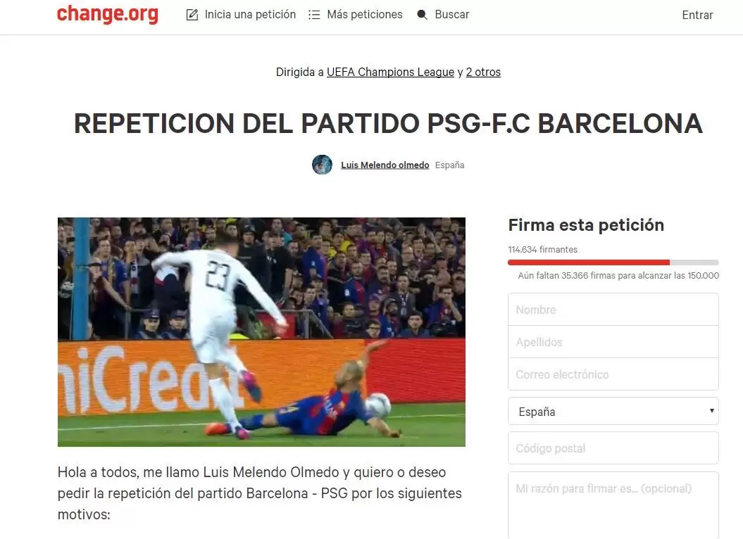 Tras la histórica y también polémica remontada del FC Barcelona sobre el PSG por la UEFA Champions League esta semana, un usuario identificado como Luis Melendo Olmedo solicitó mediante la mayor plataforma de peticiones del mundo que se repita el encuentro por 13 errores puntuales del árbitro que influyeron en el marcador.