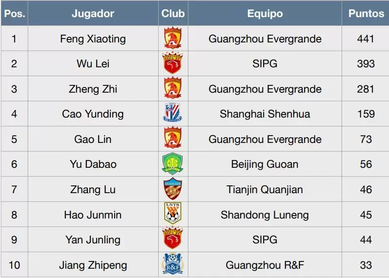 La votación fue bastante reñida entre el ganador y el finalista, Wu Lei, goleador del Shanghai SIPG en donde juegan Hulk y Darío Conca.