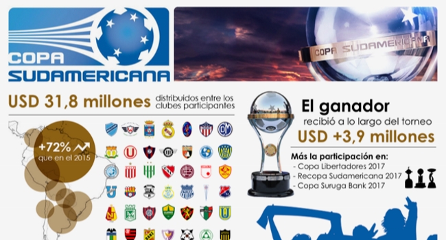 Gracias a una infografía oficial provista por la Conmebol, se supo que la anteriormente llamada Copa Sudamericana tuvo un considerable crecimiento del 72% entre las ediciones 2015 y 2016, en términos económicos y de participación de clubes a lo largo del continente.