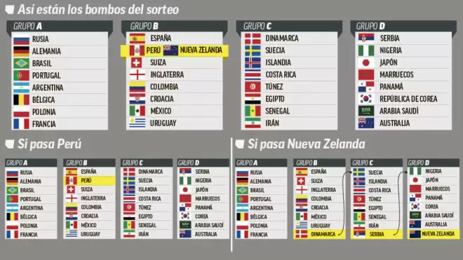 Resta tan solo definir al último clasificado entre Perú y Nueva Zelanda y así conocer si el nombre que falta se inserta en el Bombo 2 o en el Bombo 4 respectivamente.