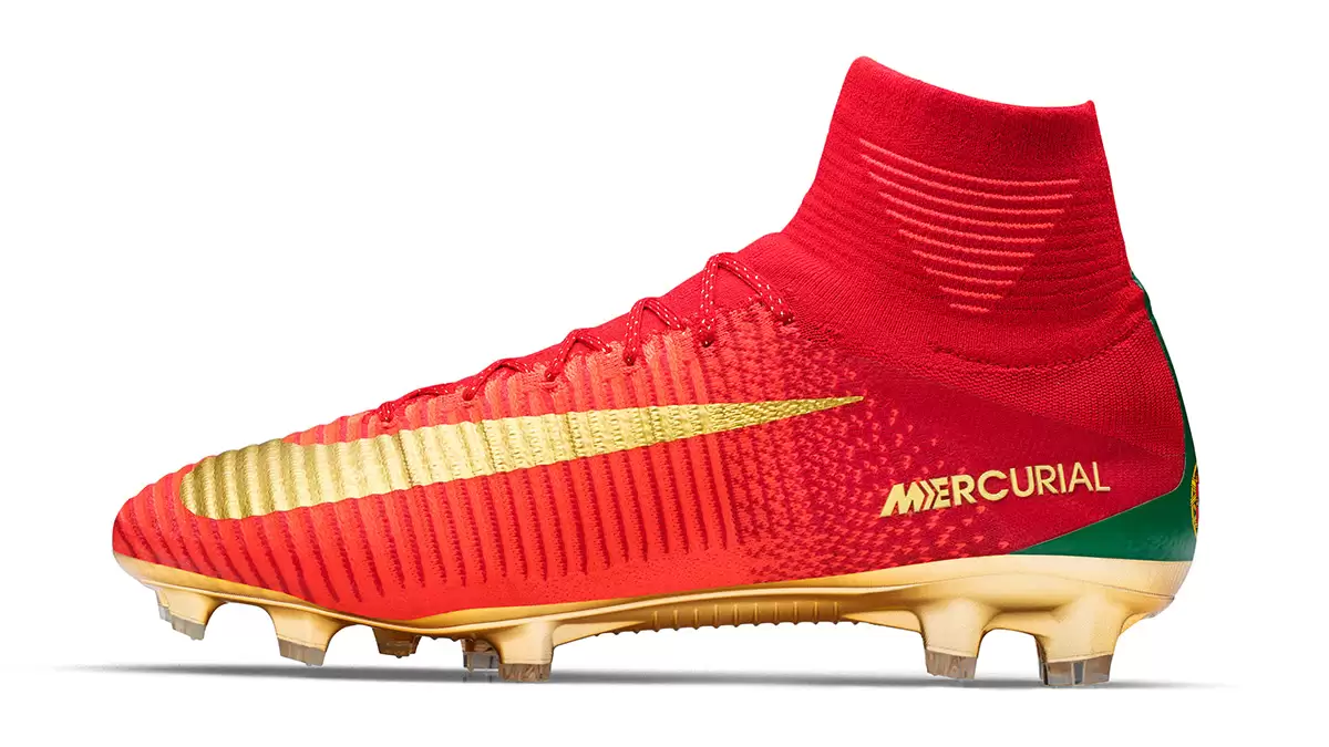 Tomando la base de sus tradicionales Mercurial Superfly V, los botines conservan lo último en tecnología y acabados que suelen ser personalizados en cada par que viste el atacante, con la novedad de su exterior en donde el swoosh de la marca se funde prolijamente con los colores representativos de la bandera lusa.