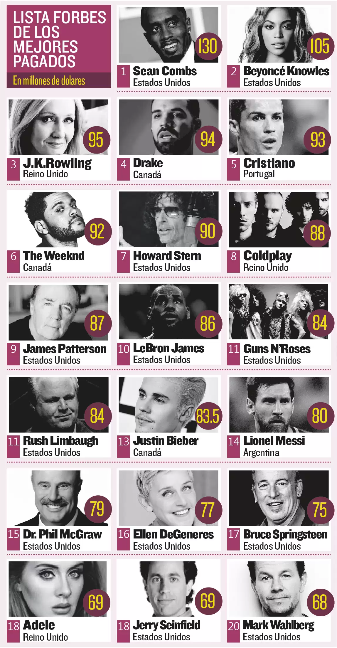 Superado por los artistas Sean Combs, Beyoncé y Drake, así como también la escritora J.K. Rowling, Ronaldo cayó en cuestión de meses a la quinta ubicación tras haber liderado el listado por mucho tiempo.