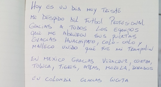 A sus 36 años de edad, el delantero chileno agradeció mediante una carta publicada en su cuenta personal de Twitter a todos los aficionados y amigos que le deja el fútbol en esta nueva etapa a un costado del deporte profesional.