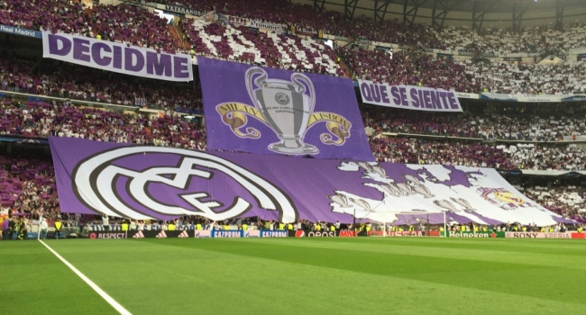A modo de una cargada hacia su clásico rival, hinchas del Real Madrid relucieron un mosaico, además de algunas banderas gigantes desplegadas en la tribuna del Bernabéu con un mapa de todas las Copas de Europa conseguidas por el club, junto con la frase que se popularizó en Argentina años atrás: ‘Decidme que se siente’.