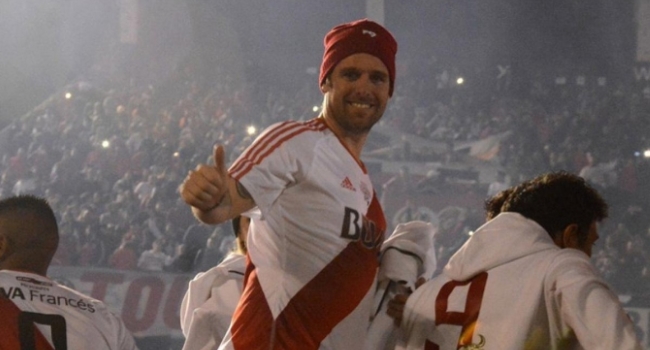 Dentro de estas escenas, el ex delantero tuvo que hacer el papel de hincha de River, para lo cual usó una bandera en su espalda junto con ropa de color rojo de su propia marca.