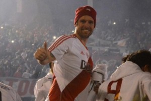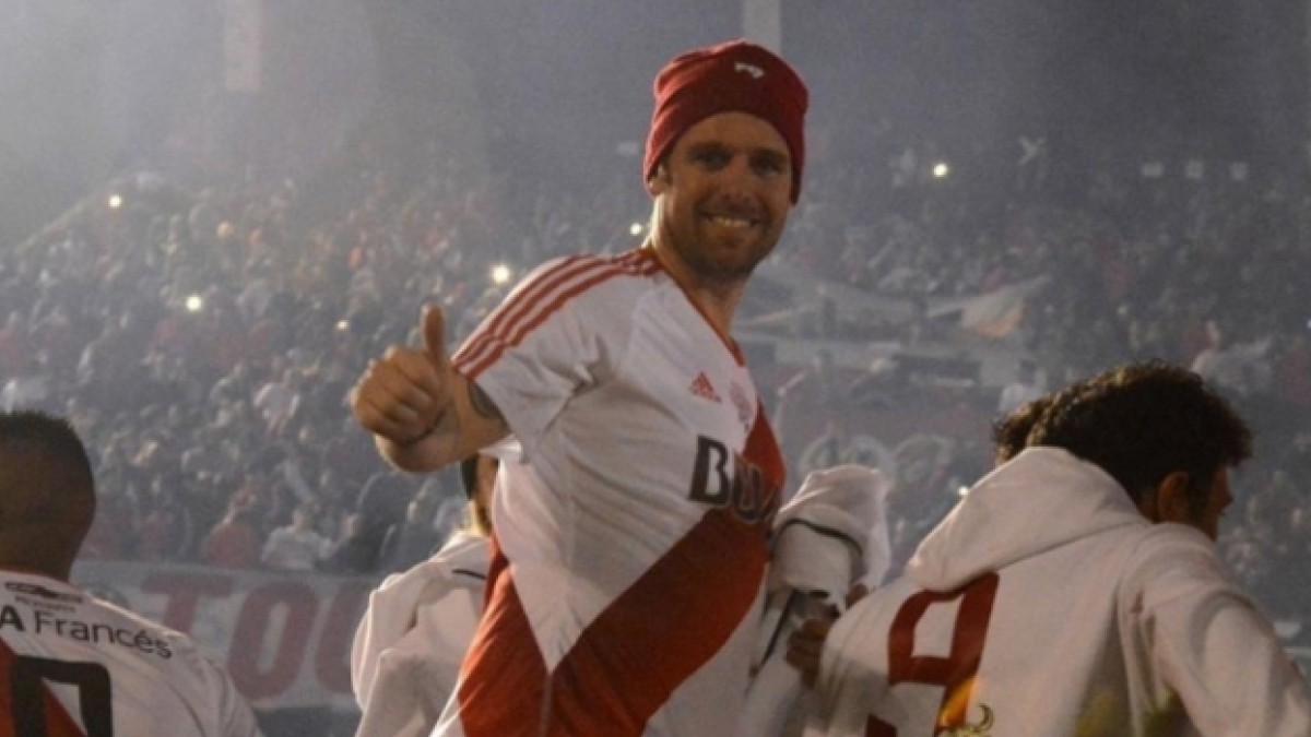 Dentro de estas escenas, el ex delantero tuvo que hacer el papel de hincha de River, para lo cual usó una bandera en su espalda junto con ropa de color rojo de su propia marca.