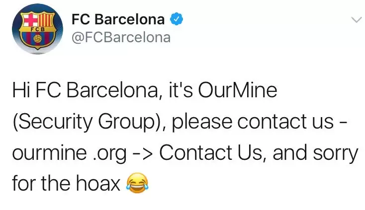 Tras anunciar falsamente a Ángel Di Maria como refuerzo del club, OurMine publicó otro mensaje en la misma cuenta oficial del equipo atribuyéndose la autoría del atentado cibernético, en donde ironiza con el FC Barcelona y pide que se contacten directamente con el grupo.