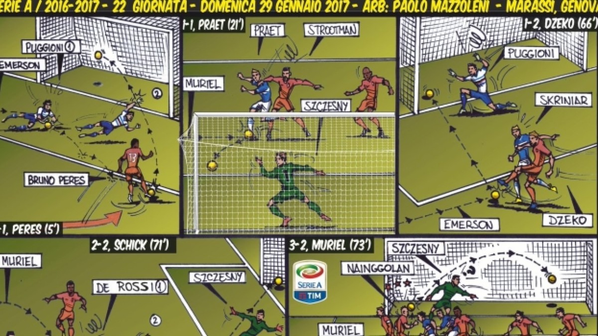 La mayoría de sus obras retrata goles de la Serie A del fútbol italiano, pero no se olvida de algunos recordados episodios de su fútbol local.
