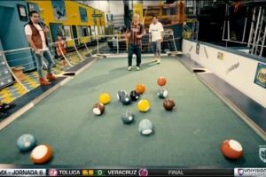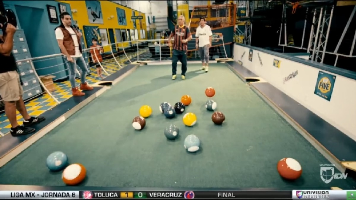 Y es que, mediante una cancha especialmente montada para la ocasión, ambos protagonizaron un juego que consistía en una partida de pool a gran escala con pelotas de fútbol.