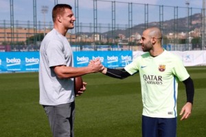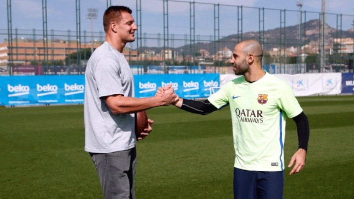 Javier Mascherano conoció en el entrenamiento del FC Barcelona a Robert Gronkowski, una de las estrellas de la NFL tras el Super Bowl ganado con los Patriots.
