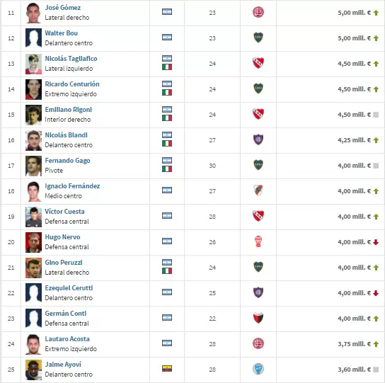 Con estadísticas del sitio especializado Transfermarkt, presentamos a continuación el listado de los futbolistas con mayor valor de mercado de la Argentina.