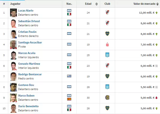 En el top 10 se destacan 3 jugadores de River Plate como Lucas Alario, Ariel Driussi y Gonzalo Martínez, y 3 de Boca, como Cristian Pavón, Rodrigo Bentancur y Darío Benedetto.