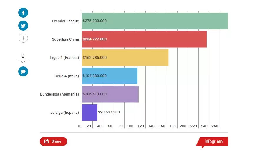 Asimismo, se reveló que gracias a las exorbitantes cifras volcadas por clubes chinos en este último mercado de pases, su competencia pasó a estar en la segunda posición con un valor que rodea los 235 millones de dólares.