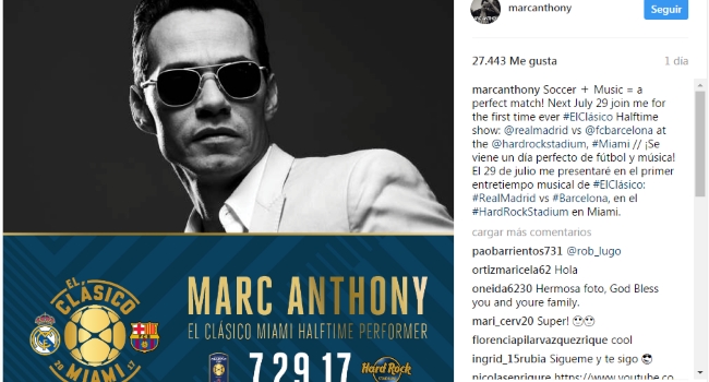 De acuerdo con una propuesta integral que busca revolucionar la industria del fútbol, Stephen Ross, organizador de la próxima ‘Copa Internacional de Campeones’, presentó oficialmente a Marc Anthony como el responsable para animar el show de medio tiempo durante el próximo derby español en suelo estadounidense.