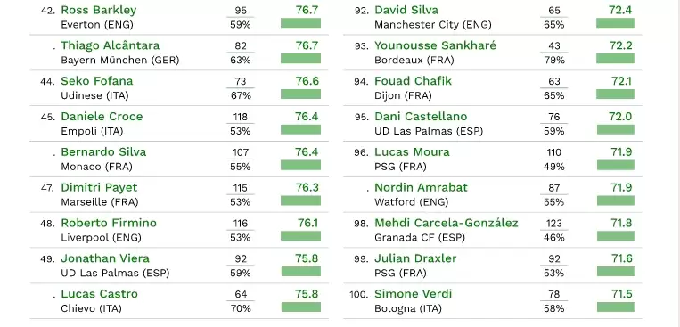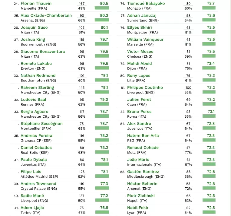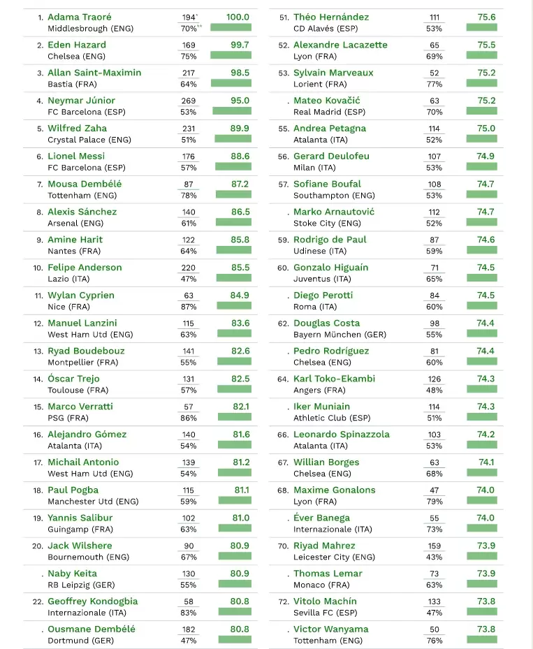Los porcentajes de efectividad surgen a partir de la cantidad de intentos de gambeta y los que resultaron exitosos, y Adama Traoré, del Middlesbrough inglés, se ubicó sorprendentemente en la cima del mismo.