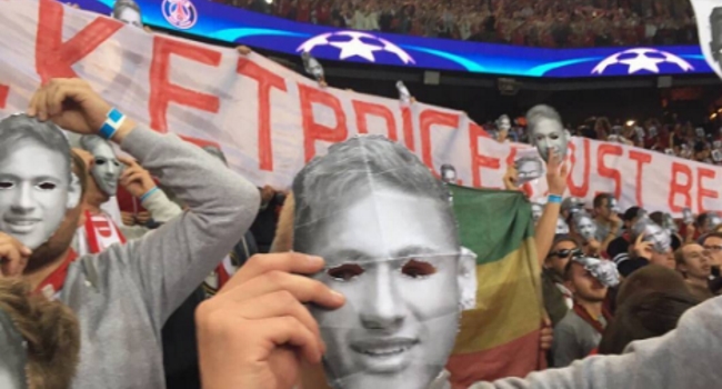 Pancartas con la leyenda de: “¿75 euros un ticket? No somos Neymar. Los precios deben ser razonables” se sumaron a caretas del astro brasileño del PSG, Neymar Jr., conocido mundialmente por percibir el sueldo más alto en el mundo del fútbol.