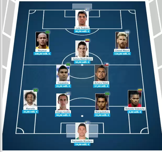 Curiosamente, el ataque lo conforman tres de las figuras del FC Barcelona como son Lionel Messi, Luis Suárez y Neymar Jr, al igual que el mediocampo lo comparten dos compañeros de equipo en el Real Madrid como son James Rodríguez y Casemiro.