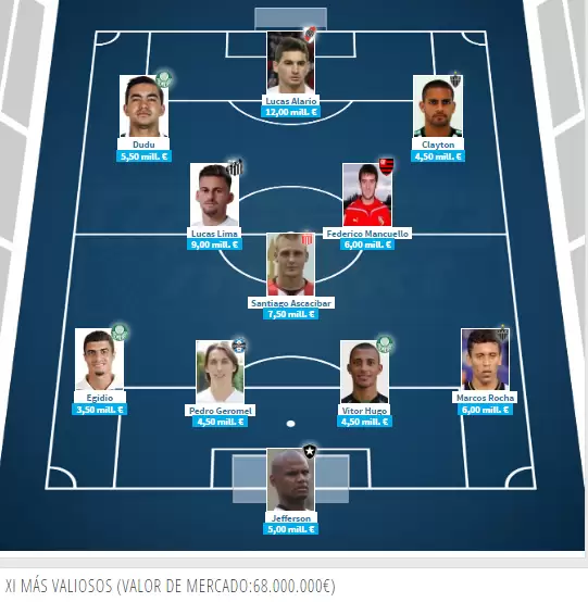Con estadísticas del sitio especializado Transfermarkt, presentamos el once más valioso del torneo, equipo que cuenta con tres argentinos y ocho brasileros y alcanza un valor de 68 millones de euros.