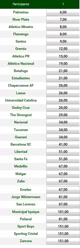 El sitio iApuestas recopiló estadísticas de los distintos portales de apuestas deportivas y así Palmeiras se ubica en lo más alto de la tabla como el club favorito a quedarse con la CONMEBOL Libertadores 2017.