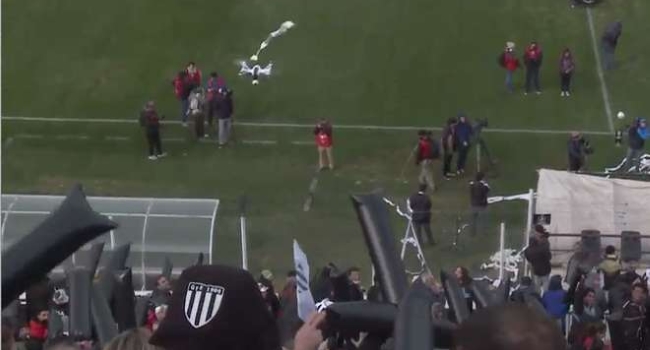 No contentos con todos los ingredientes y clima que genera normalmente uno de los partidos que otorga un cupo a la Primera B Nacional, simpatizantes de Gimnasia bajaron un dron con una serpentina, mientras el artefacto recorría las tribunas realizando diversas tomas para la transmisión en vivo.