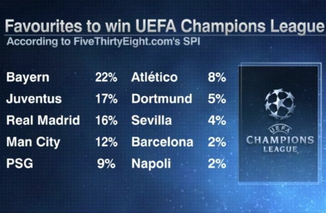 Según este portal, el equipo alemán tiene un 22% de ganar el título, seguido de la Juventus, con 17%, tras el 2 a 0 sobre el Porto. Con 16% aparece en el tercer lugar el Real Madrid, que derrotó 3 a 1 al Napoli.