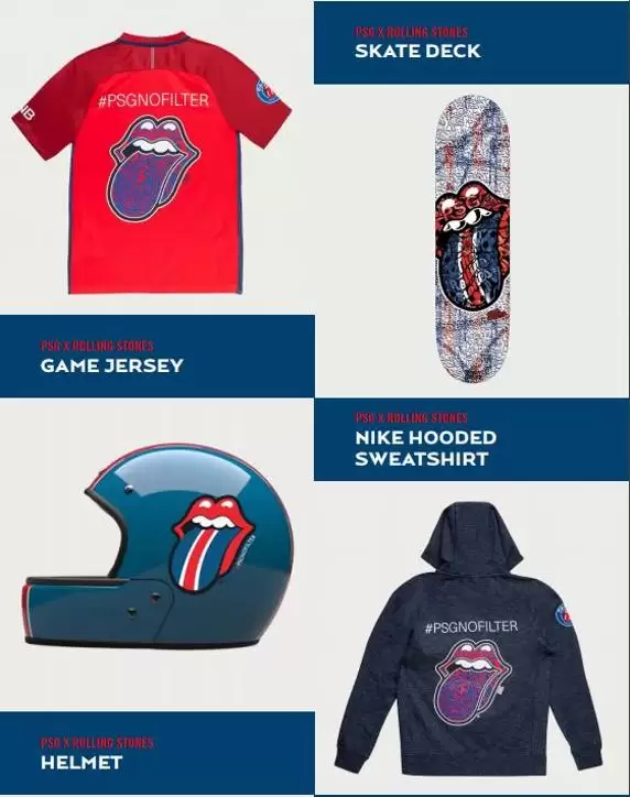 Aprovechando la expectativa que generan los recitales en la capital francesa, el PSG lanzó su propia línea de accesorios e indumentaria en una mezcla entre sus colores y logos con los de la banera británica y los del grupo musical.