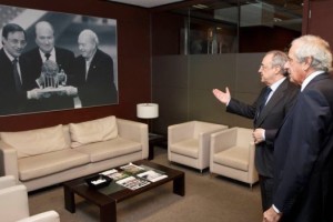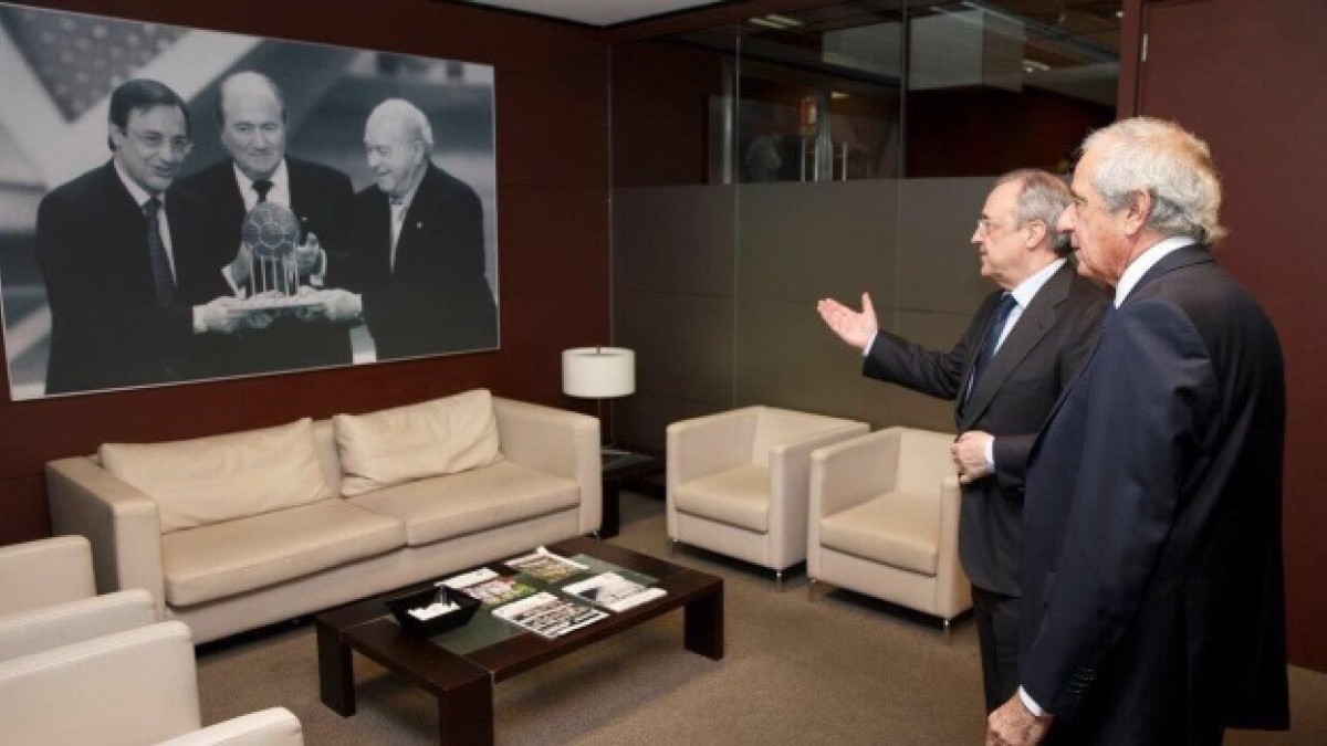 En las inmediaciones del estadio Santiago Bernabéu, ambos dirigentes fueron fotografiados mientras se entregaban mutuamente históricos presentes tales como una carta firmada por el ex presidente del club que da nombre al estadio, en la cual se presenta a Raimundo Saporta como representante delegado para negociar el pase de una de las glorias que compartieron ambos equipos como fue Alfredo Di Stéfano.