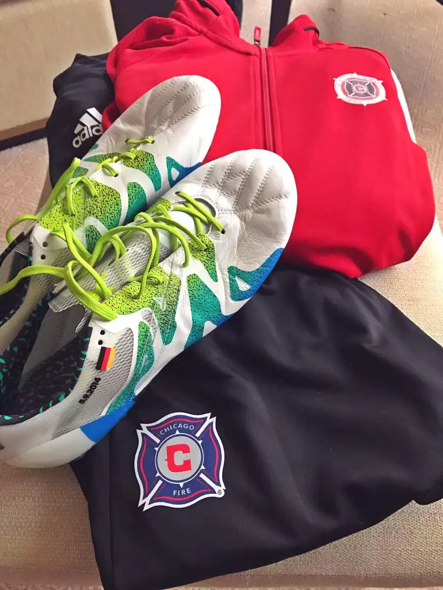 Se trata de los adidas X 15.1 con un modelo tipo ‘camuflage’ en tonos más claros, con el detalle de la bandera alemana en un costado junto con la fecha en la que se puso de novio con la ex tenista serbia Ana Ivanovic.