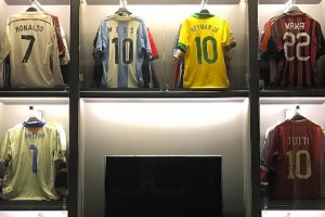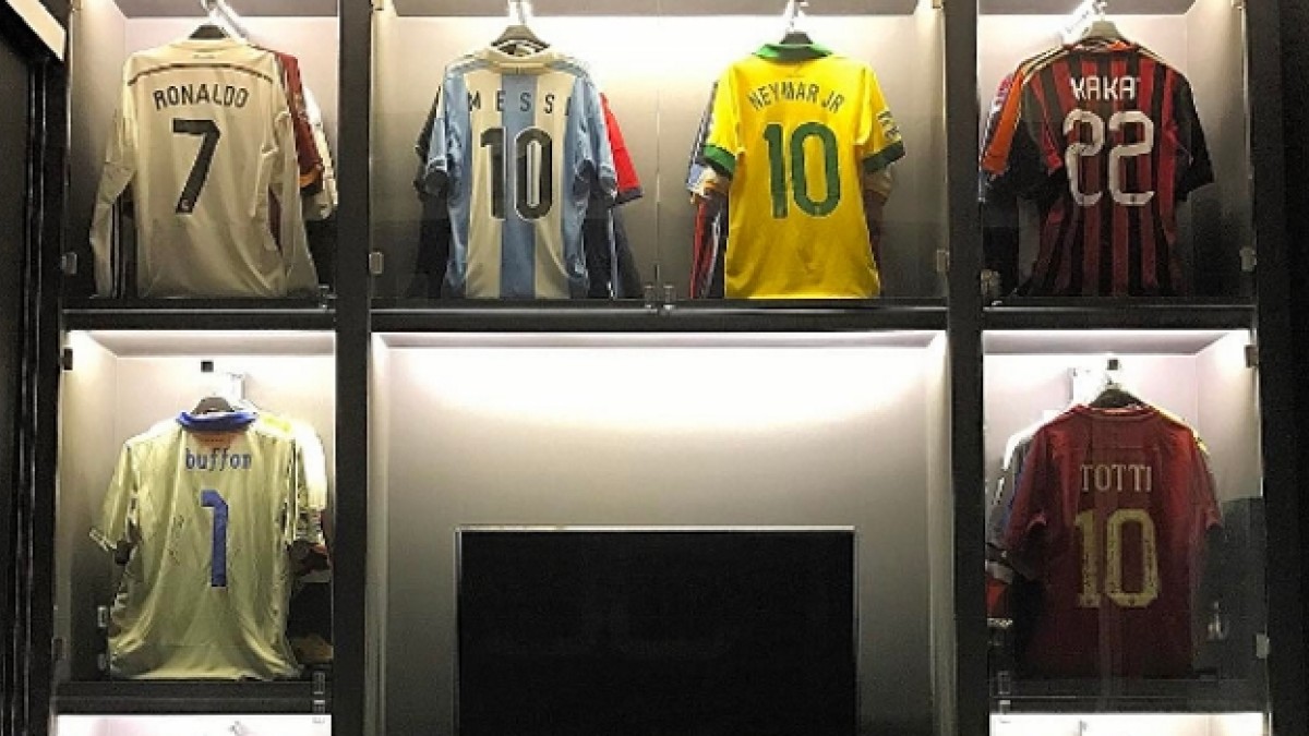 Entre otras, que no se distinguen al estar colgadas detrás, aparece un buzo de la Selección de Italia de Gianluigi Buffon, una camiseta del AC Milan de Zlatan Ibrahimovic, dos de Lionel Messi, una del FC Barcelona y otra de la Selección Argentina, otra del AC Milan pero de Kaká, una de la Selección brasileña que le perteneció a Neymar Jr., una del Real Madrid de Cristiano Ronaldo y la emblemática número 10 de la AS Roma de su ex compañero Franceso Totti.