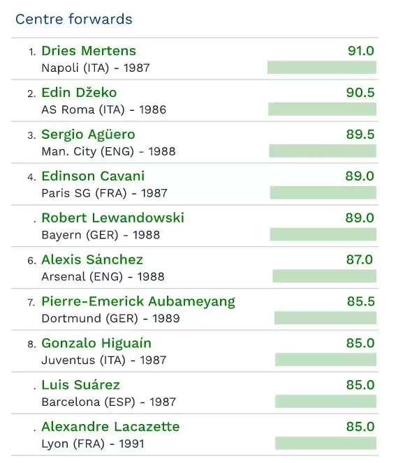 Según reveló un estudio del Centre for Sports Studies (CIES) esta semana, cinco jugadores sudamericanos forman parte del Top 10 de centro atacantes en el mundo que actualmente lidera el belga del Nápoli, Dries Mertens.