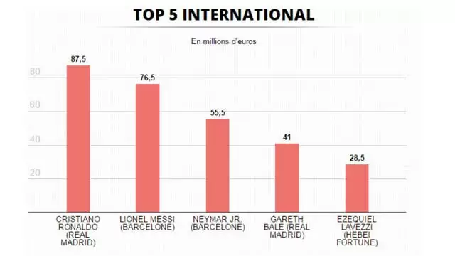 La lista, que no incluyó al argentino Carlos Tévez debido a la fecha en la cual se incorporó al Shanghai Shenhua, está compuesta después del portugués por Lionel Messi, Neymar Jr., Gareth Bale y Ezequiel Lavezzi.