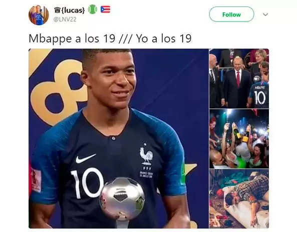 En pocas horas se convirtió en tendencia en Twitter. Algunos de los más divertidos comparaban lo que hacen los estudiantes a esa edad, mientras Mbappé ya juega en el Paris Saint-Germain y es campeón del Mundo con la Selección de Francia. Todo comenzó luego de la actuación ante la Selección argentina en los Octavos de Final, el sufrimiento de los hinchas argentinos fue canalizado en humor.