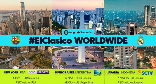 En una propuesta que involucrará pantallas gigantes, food trucks, música en vivo y la presencia de embajadores que pasaron alguna vez por alguno de los dos equipos, el campeonato español dirá presente en ciudades de la talla de: Nueva York (Estados Unidos), Buenos Aires (Argentina), Bogotá (Colombia), Santiago (Chile), Bruselas (Bélgica), Luxemburgo (Luxemburgo), Bratislava (Eslovaquia), Copenhague (Dinamarca), Nueva Dehli (India), Yakarta (Indonesia) y más bajo la misma temática.