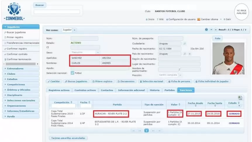 Resulta que si bien Sánchez fue expulsado ante Huracán por las semifinales de la Sudamericana 2015 y que la sanción de su momento fue de tres fechas (de las cuales el jugador cumplió tan solo una), la Confederación Sudamericana de Fútbol habría otorgado una especie de amnistía total en el año 2016 con motivo de festejar su Centenario.
