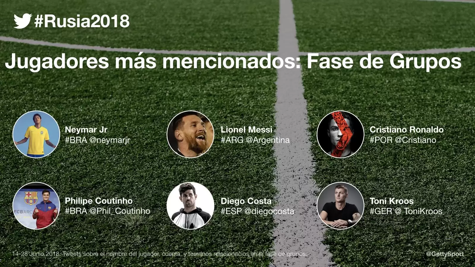 La lista de jugadores más mencionados en Twitter, hasta el momento, la encabeza el brasileño Neymar Jr., seguido por el argentino Lionel Messi y el portugués Cristiano Ronaldo.