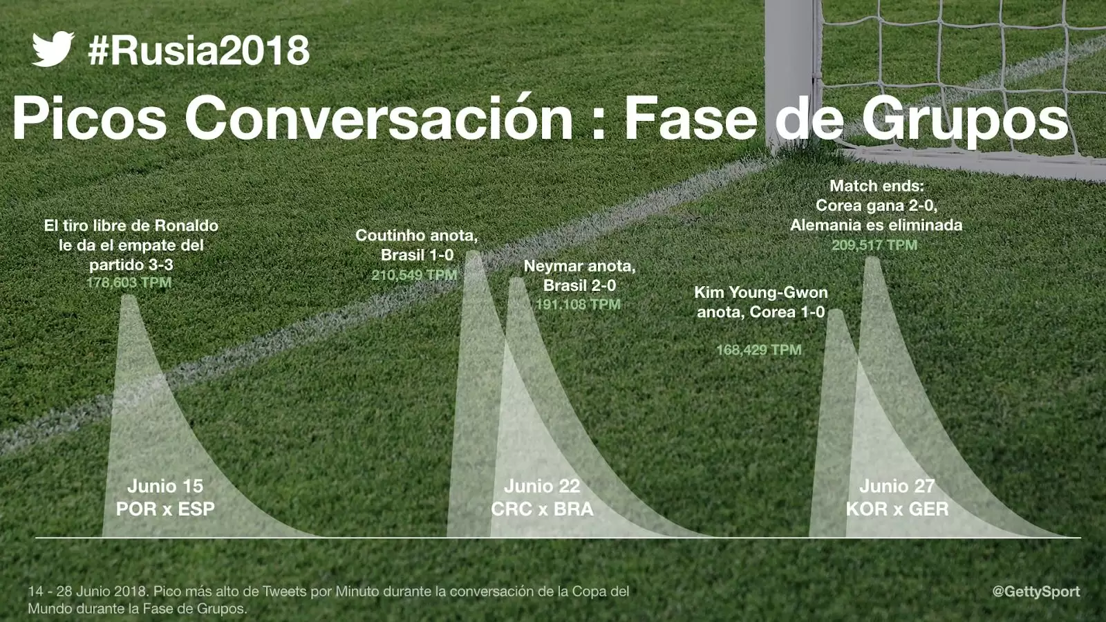 Con Costa Rica vs. Brasil y Alemania vs. Corea del Sur como los mejores partidos de la ronda, tiene sentido que cuatro de los cinco momentos más Twitteados (con base en la cantidad de Tweets por minuto) de la fase de grupos, se hayan vivido durante dichos juegos.