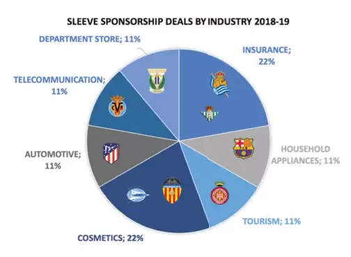 En cuanto a los patrocinadores situados en las mangas, las industrias de seguros y cosméticos contienen un 22% del total cada uno.