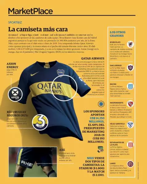 Pero la aerolínea catarí no es la única marca que ocupa un lugar en la indumentaria oficial del “Xeneize”. También juegan su partido Axion Energy, Axe y Río Uruguay Seguros. Según el arreglo entre las dos partes, los 6,75 millones de dólares, que pagará Qatar Airways, equivalen al 50% de los ingresos de marketing presupuestados para la temporada 2018/19.