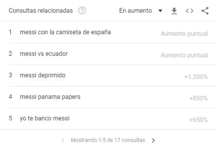 Lionel Messi recibió las búsquedas más variadas, no se centraron en un momento o una jugada particular del partido. Las cinco búsquedas más solicitadas fueron: Messi con la camiseta de España, Messi vs Ecuador, Messi Deprimido, Messi Panamá Papers y yo te banco Messi.
