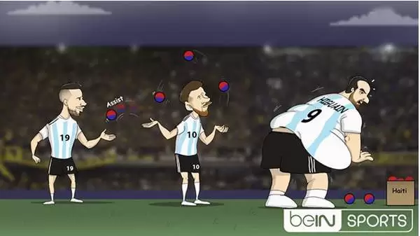 En el meme, que fue publicado en la cuenta oficial de Instagram de la cadena árabe, puede verse a Higuaín con sobrepeso intentando recoger unas pelotas, mientras que Messi hace malabares y le da una asistencia a Sergio Agüero. La caricatura hace referencia a la jugada en la que Higuaín no llegó a conectar un pase de Messi y por lo tanto no pudo anotar y el gol convirtió el “Kun” cuando ingresó en el segundo tiempo.