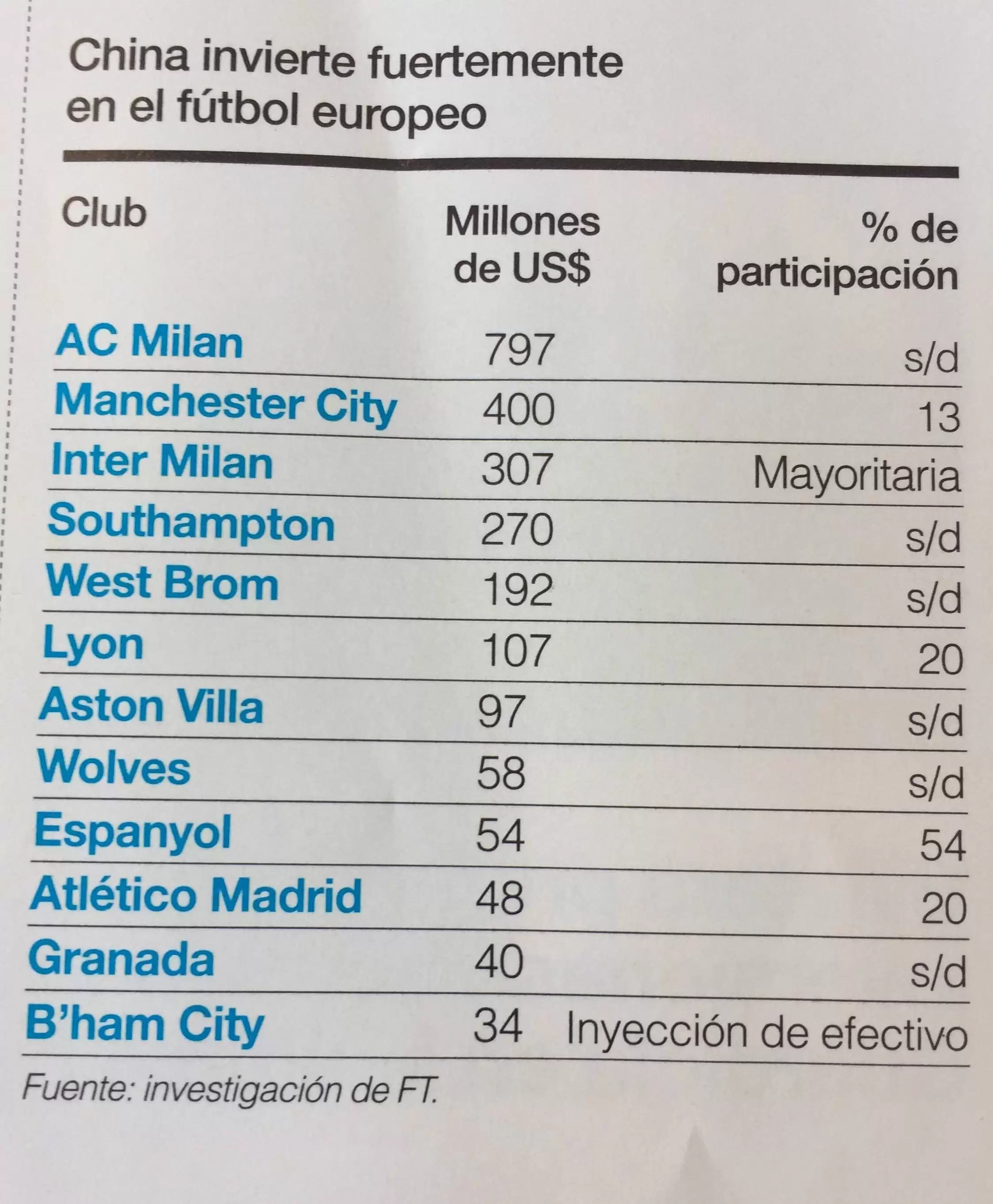 Gracias a la información de FT, es justamente el conjunto italiano (AC Milán) en donde más millones de dólares están invertidos desde China, seguido por el Manchester City, el Inter de Milán, el Southampton, West Bromwich Albion completando el Top 5.