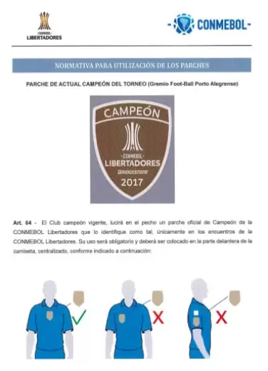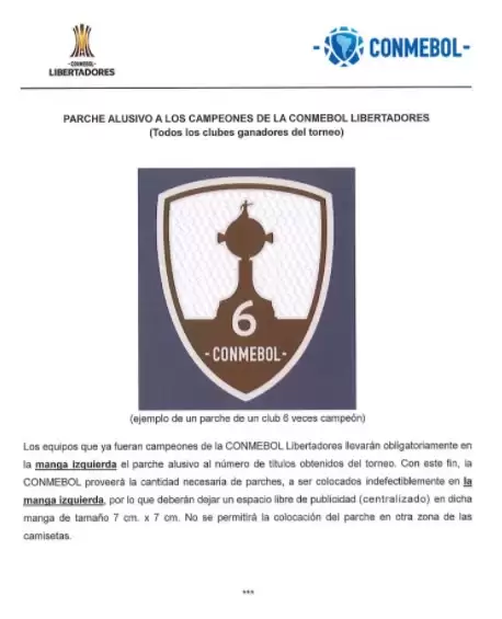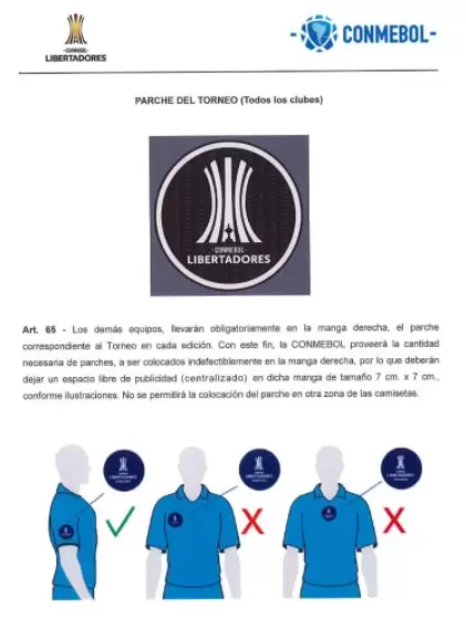 El parche alusivo a los campeones de alguna edición anterior ocupará un lugar en la manga izquierda. La CONMEBOL, para su buena implementación, les facilita los parches a los equipos. Si un equipo no cumple esta serie de reglas la Confederación aplicará una multa económica.
