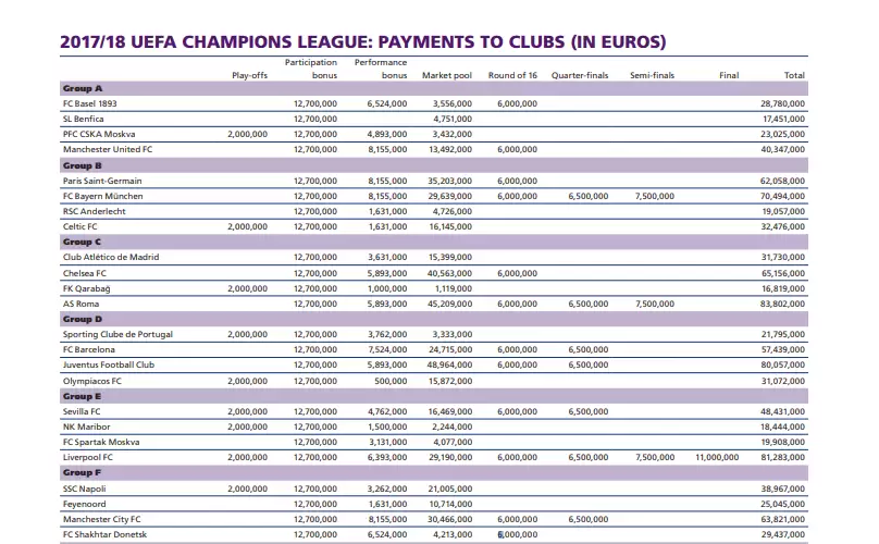 A los equipos que participaron de la Fase de grupos se le garantizó un pago mínimo de 12,7 millones de euros, pagándosele 1,5 millones por victoria y 500.000 por empate. Además, por ir avanzando en las fases el valor de los premios iba aumentando: 6 millones de euros por llegar a Octavos, 6,5 por los Cuartos de Final y 7,5 millones por llegar a la semifinales. El subcampeón de la UEFA Champions League, el Liverpool, recibió 11 millones en premios extras, mientras que el Real Madrid, campeón de la última temporada obtuvo 15,5 millones adicionales.
