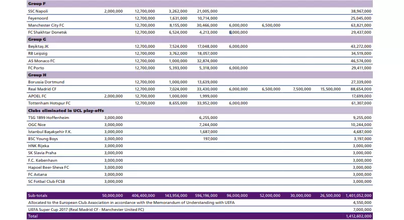 A los equipos que participaron de la Fase de grupos se le garantizó un pago mínimo de 12,7 millones de euros, pagándosele 1,5 millones por victoria y 500.000 por empate. Además, por ir avanzando en las fases el valor de los premios iba aumentando: 6 millones de euros por llegar a Octavos, 6,5 por los Cuartos de Final y 7,5 millones por llegar a la semifinales. El subcampeón de la UEFA Champions League, el Liverpool, recibió 11 millones en premios extras, mientras que el Real Madrid, campeón de la última temporada obtuvo 15,5 millones adicionales.