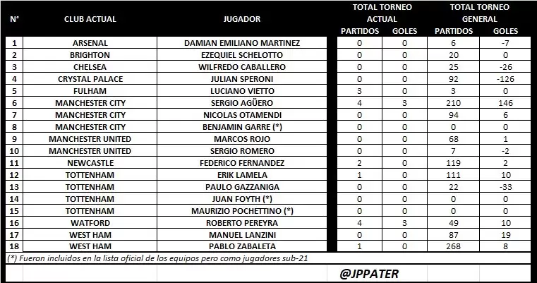 La Premier League inglesa ha decrecido en su número de argentinos con relación a temporadas anteriores, no obstante hay 18 representantes el día de hoy en sus plantillas.