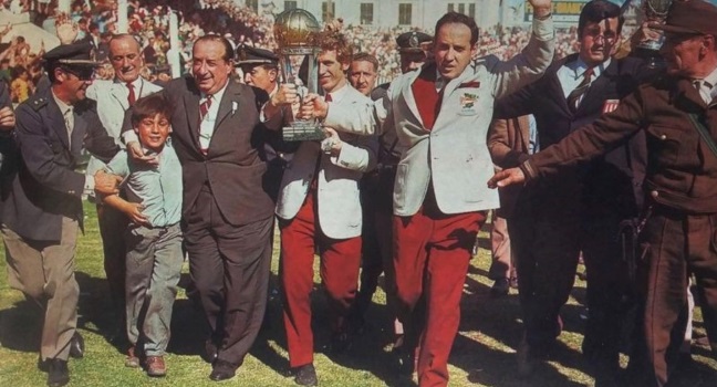 En la imagen se puede ver a un chico que viste camisa celeste y pantalón gris abrazado a Mariano Mangano, quien fuera presidente del club entre 1960 y 1970. De la imagen también participa Osvaldo Zubeldía y la escena forma parte de la vuelta olímpica que dieron los jugadores en la antigua cancha de 1 y 57 en La Plata.