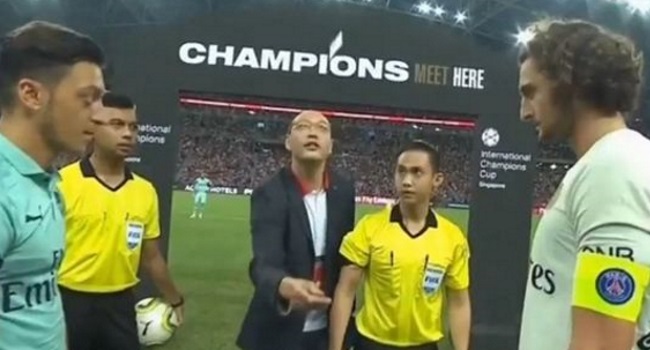 En él, la característica moneda lanzada por los árbitros fue reemplazada por una tarjeta de crédito. Todo iba normal hasta que entre los jugadores y los árbitros apareció un hombre vestido de traje. Fue entonces cuando el árbitro del encuentro les explicó a Mesut Özil y Adrien Rabiot, capitanes de ambos equipos, que el sorteo no sería realizado con una moneda, sino con una tarjeta de crédito.