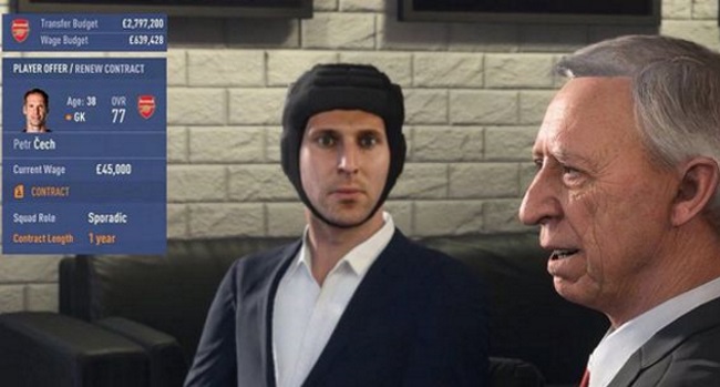 En uno de los modos de juego puede verse al actual arquero del Arsenal de Inglaterra negociando su contrato con los directivos de su club. Vestido con un traje formal, Cech lleva a cabo una reunión junto a su agente, pero el detalle es que también viste su casco protector.